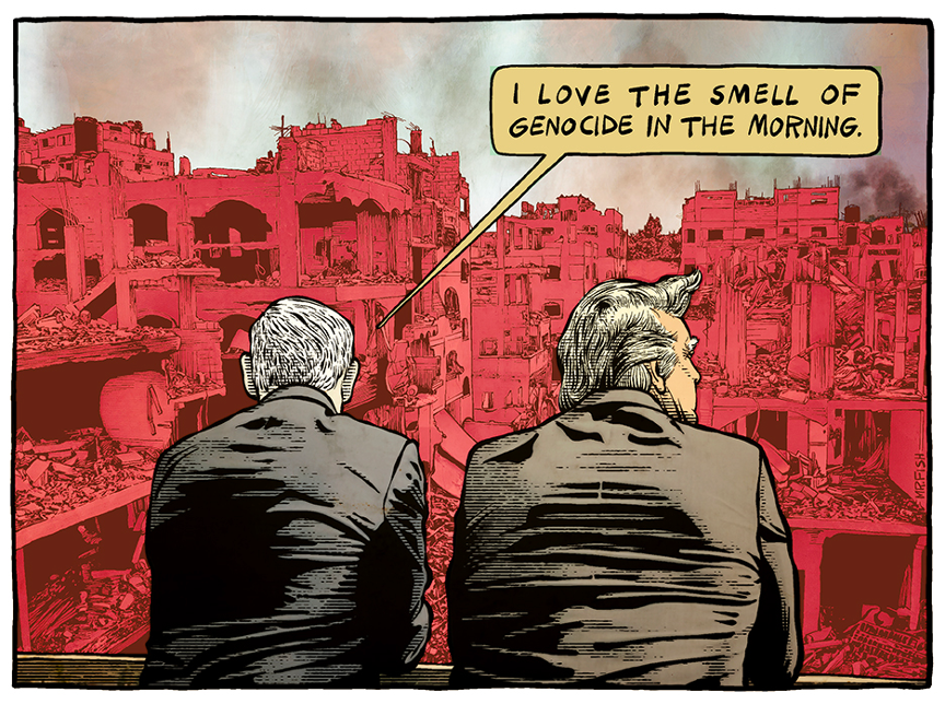 Such manipulative, dare I say fascistic with a capital F, behavior as the writing of American history to exclude the barbarism of the power elite must, of course—just for the sake of adhering to the physics of how recollections are first formed before they’re flung into the past—begin with the falsification of current events as they happen so that the spin that cements them into the collective memory of the public is sufficiently selective to protect the reputation of the ruling class. That’s why, for example, particularly in recent years, whenever the United States decides to bomb another country, whether it’s Bosnia or Panama or Libya or Sudan or Iraq or Afghanistan or Iran or Venezuela (note to publisher: it might be wise to allow some extra space here as this list is guaranteed to grow substantially in the weeks and months and years ahead), or whenever the United States decides to directly supply the training and the financial backing and the weaponry to other countries containing potential struggles for self-determination and sovereignty unrelated to American big business, whether it’s in Palestine or Turkey or the Philippines or Saudi Arabia or Brazil or Chile or Guatemala or Nicaragua or Argentina or Haiti, etcetera, the atrocities are always reported to be committed either in self-defense or in the interest of the health and wellbeing of the civilians on the ground in or around the area that’s being bombed, with debate, at least in the mainstream media or statements released by government officials, never involving a historical perspective that might label either claim as complete and utter bullshit.